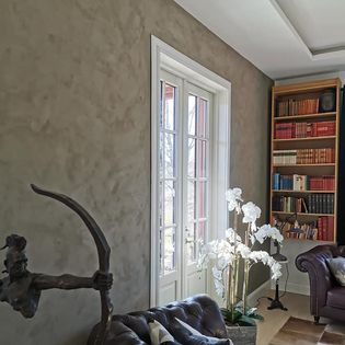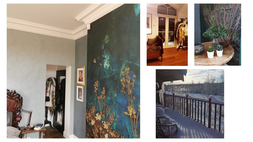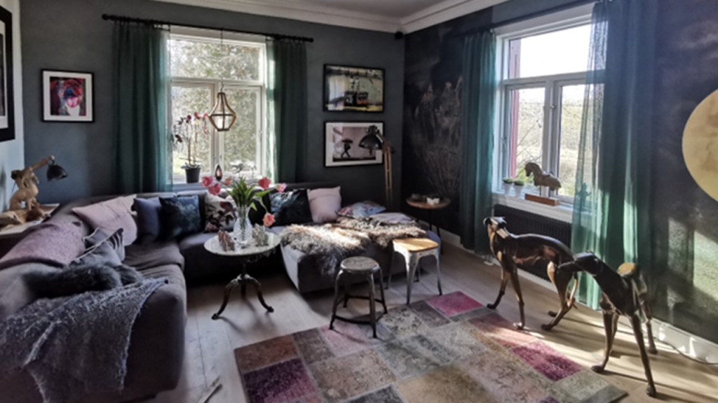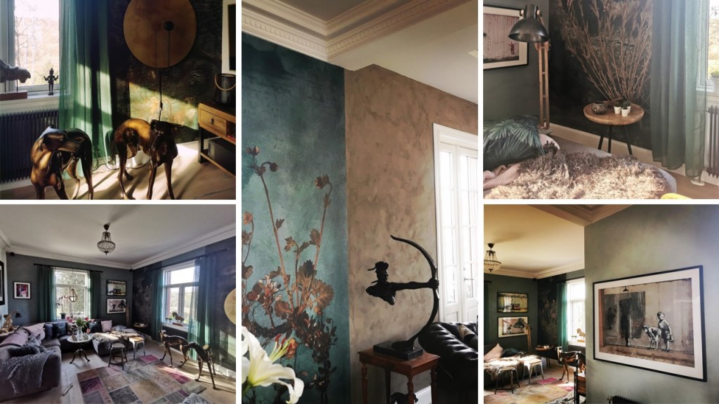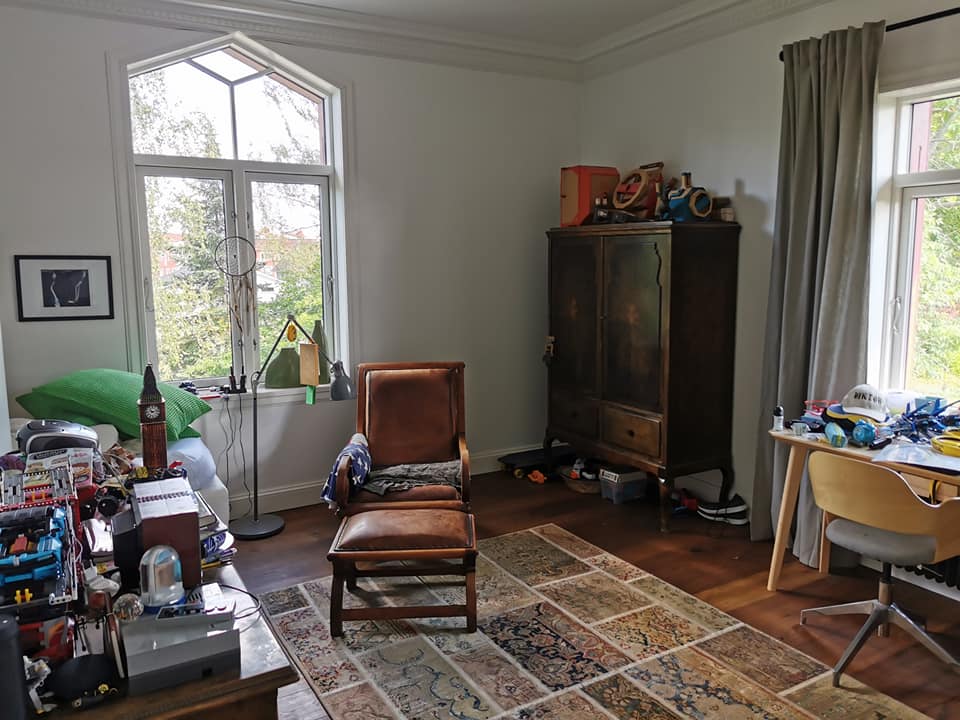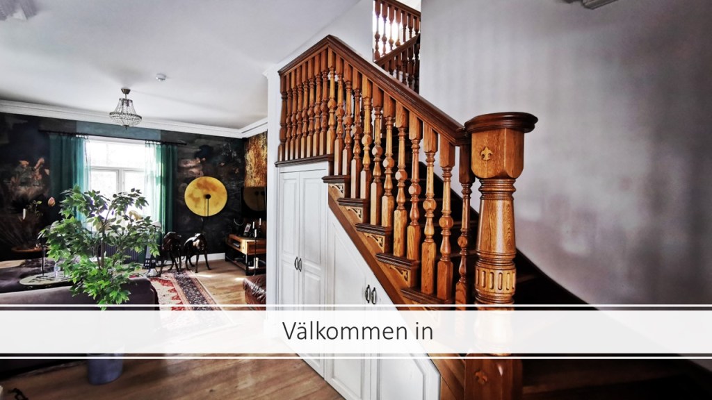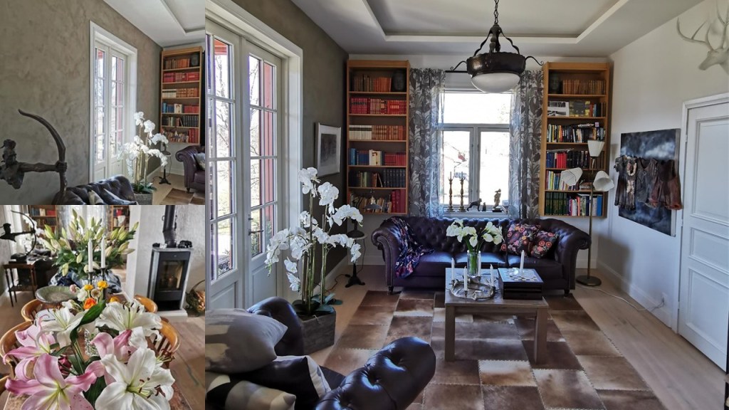 Detta hus ger den nya ägaren ett kanvass att få vara kreativ, skapa en vacker och harmonisk hemmiljö. Stora utrymmen med naturligt ljus ger möjlighet att kunna visa stora konstinstallationer och personliga intryck. Idag sitter tapeter som konst redan på väggarna som ger det öppna utrymmet känslan av separerade rum utan att man satt upp väggar för att bryta ljusinsläpp och möjligheten till umgänge för alla åldrar, även om man kan finna avskildhet.