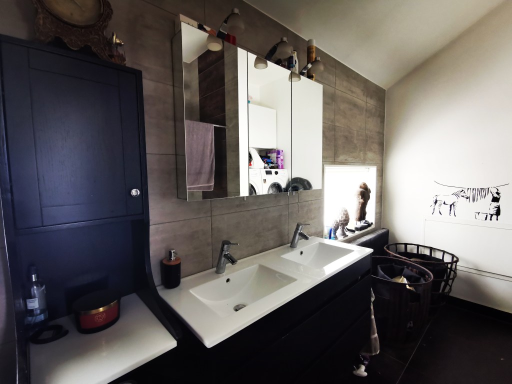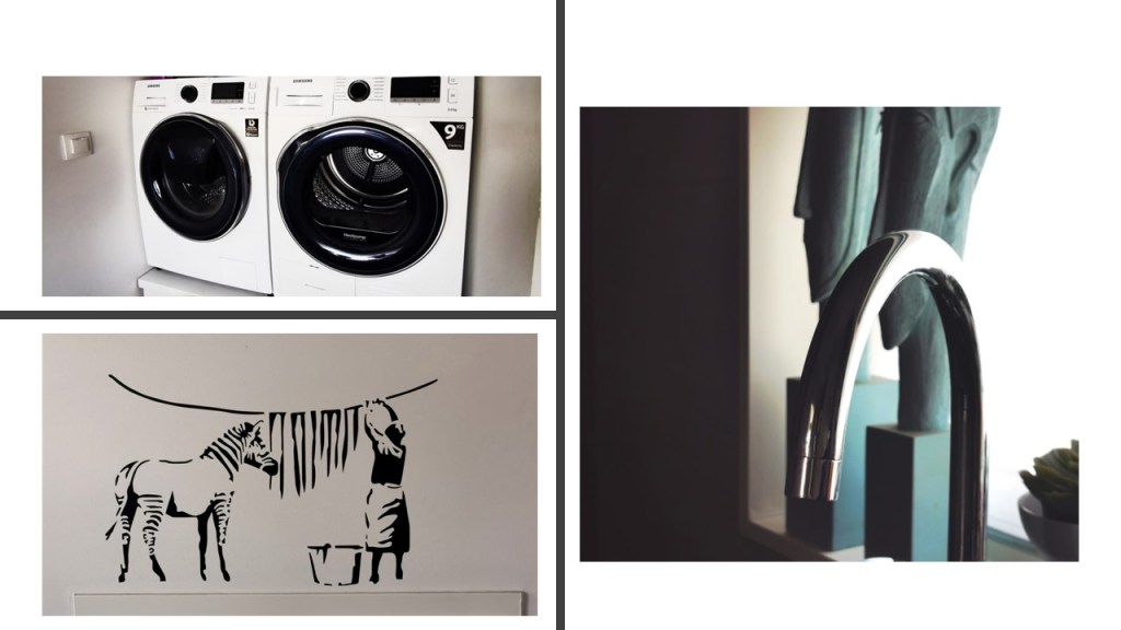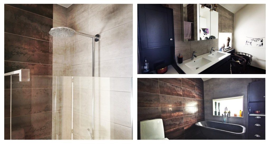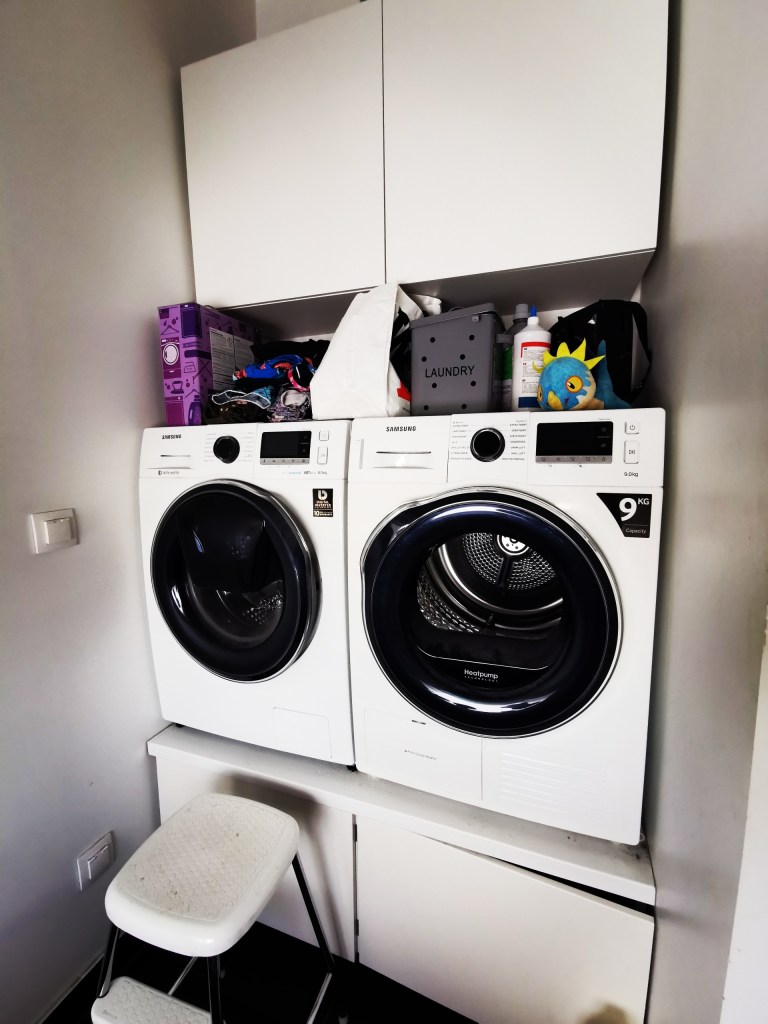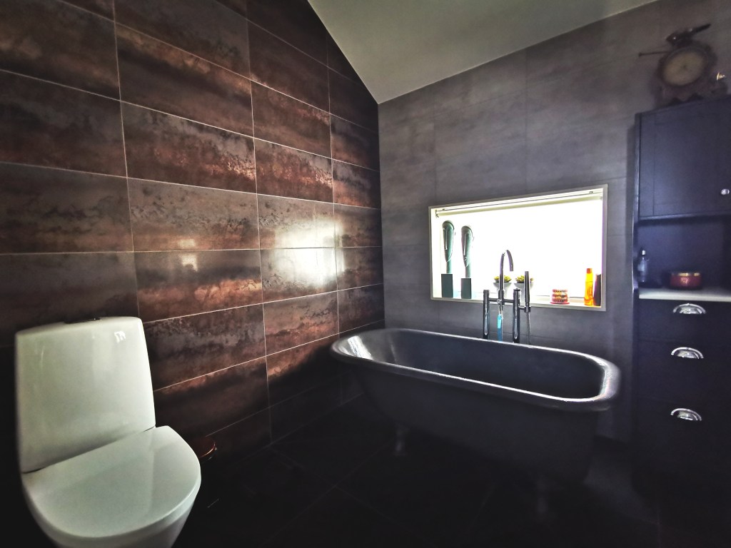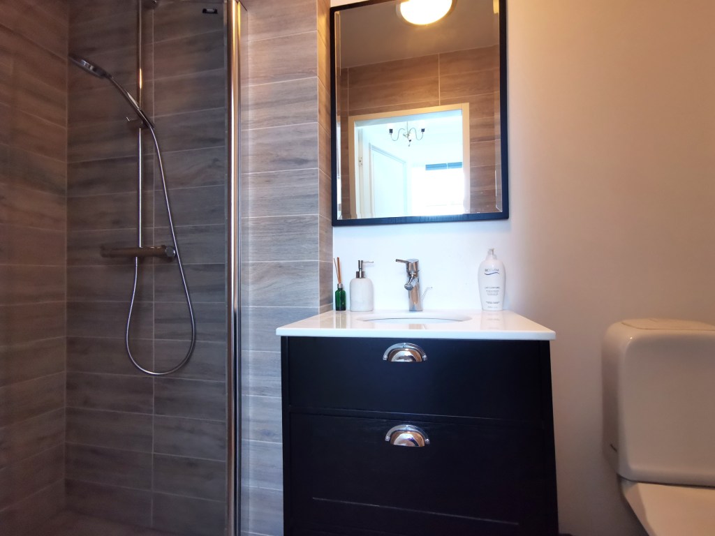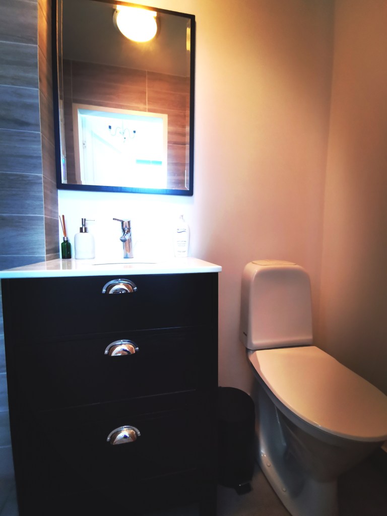 På övervåningen har vi ett kombinerat badrum med platsbyggd hylla för tvättmaskin och torktumlare.