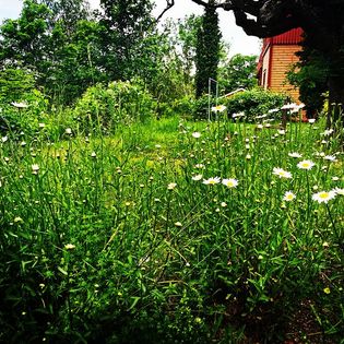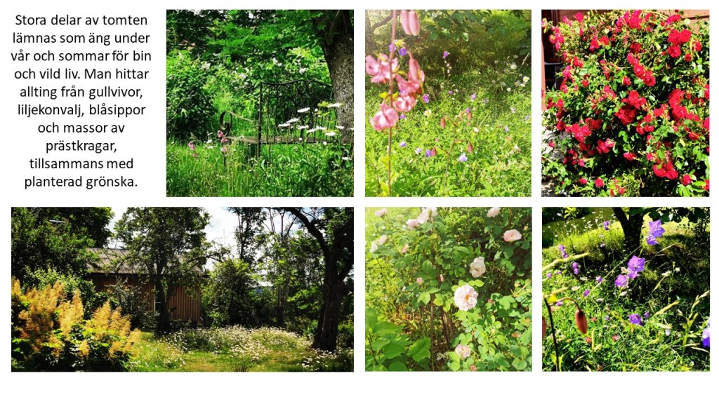 Tomten har tillåtits vara lite ‘vild och galen’ för att främja bin och fåglar. För den som har intresse finns alla möjligheter att ha sina egna kupor för att göra egen honung. På tomten finns även en potatiskällare för alla frukter som går att plocka. Många olika sorters äpplen och päron. Plommonträd och bigarråer finns också. Här får man vara snabb och komma innan fåglarna hittar dem.